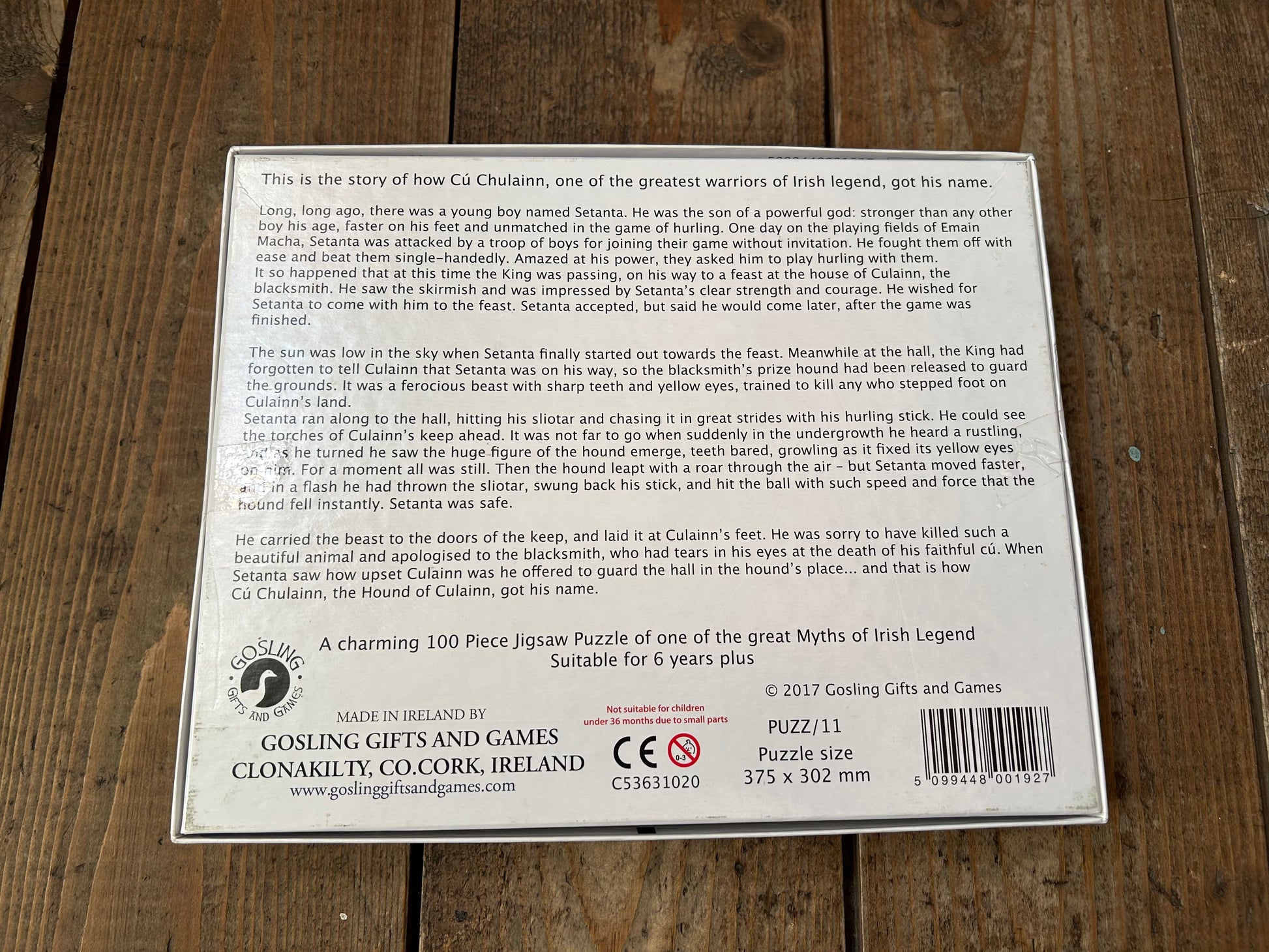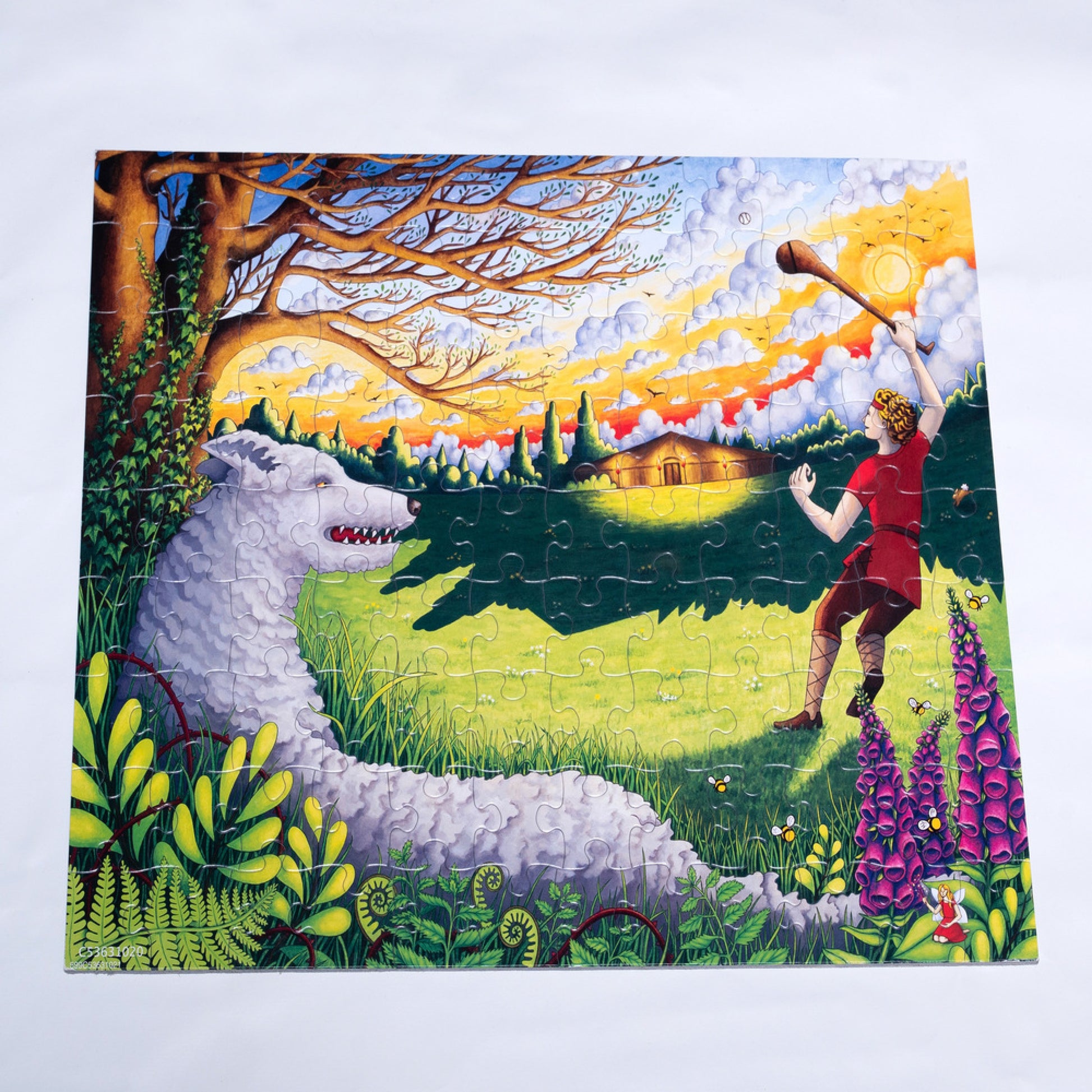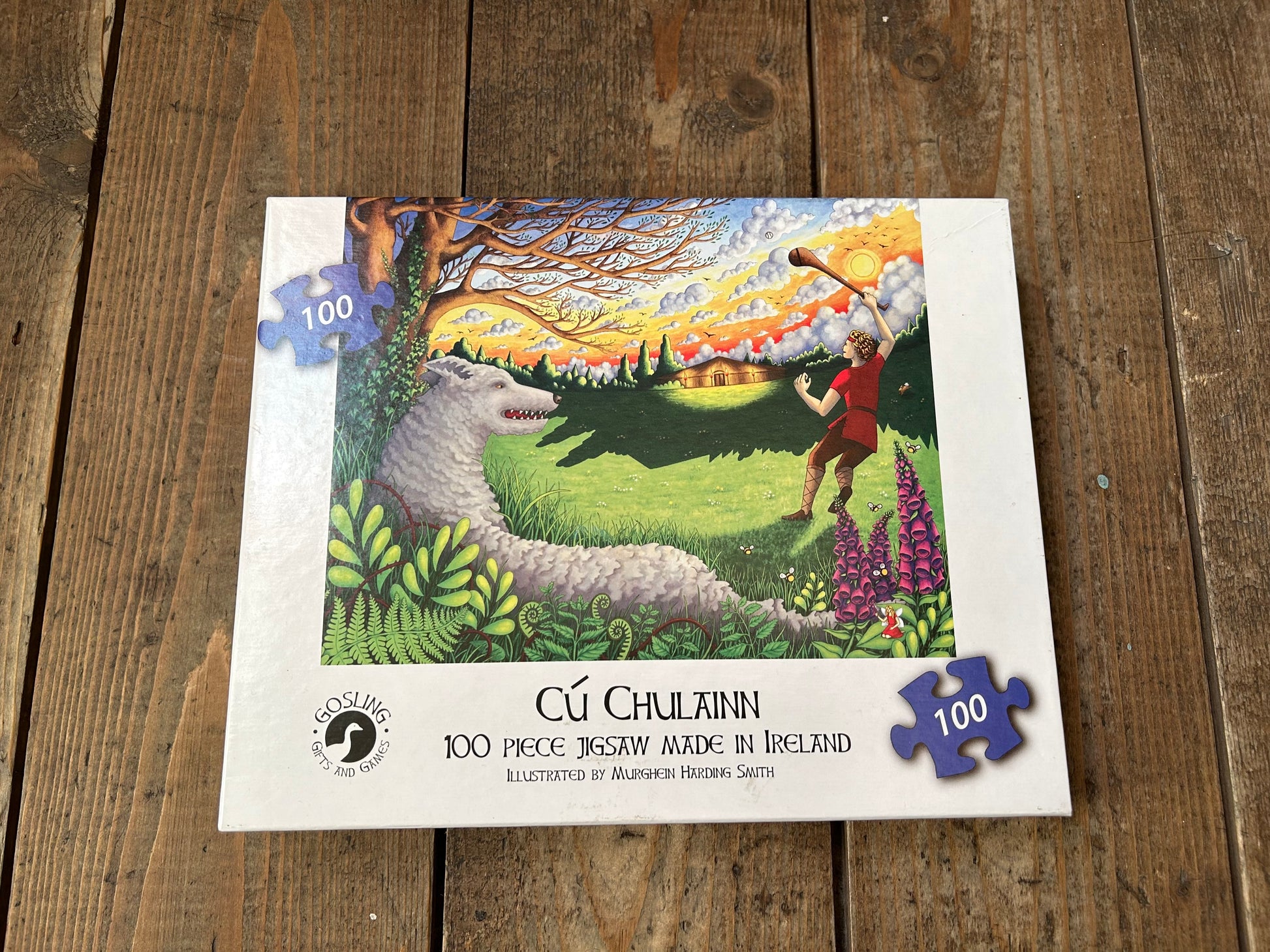 Rediscover one of Ireland’s most famous legends with this 100 piece puzzle of Cú Chulainn, the strongest warrior in Irish myth. Find out how Cú Chulainn got his name by reading along with the story printed on the puzzle box. The young hero is pictured mid-swing with his sliotar and hurling stick, while a fearsome hound looks on from the thorny undergrowth! Designed with vivid colours and rich details, there are also bees, a rabbit and even a fairy to be found in this original take on a traditional story.